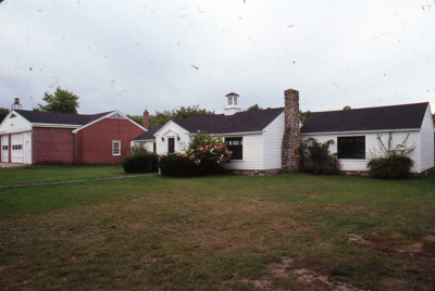 Peegee hydrangeas grow in profusion in front of the Casco Public Library in Casco, Maine. This image depicts the library before its renovation.