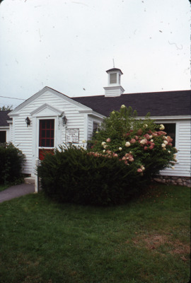 Peegee hydrangeas grow in profusion in front of the Casco Public Library in Casco, Maine. This image depicts the library before its renovation.