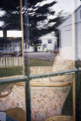 A view through a window at the Casco Public Library in Casco, Maine, reveals a flowered armchair and a row of books.