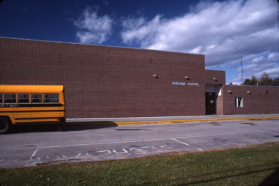 A school bus is drawn up alongside a long brick building, with the words "Chelsea School" written on the side. This appears to be the home of the Chelsea Elementary School Library in Chelsea, Maine.