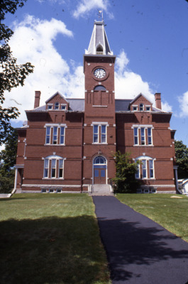 The Stewart Free Library in Corinna, Maine, stands majestically on a green hill.