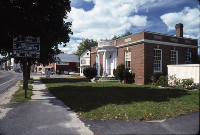 The main road of the village runs past the Bonney Memorial Library in Cornish, Maine.