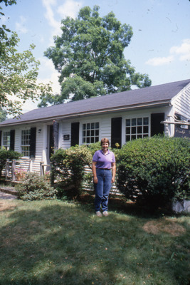 A woman, possibly a librarian, stands in front of the Cundy's Harbor Library in Harpswell, Maine.
