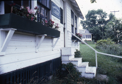 The Damariscotta Mills Library, now closed, boasts flowering window boxes. It was located in Damariscotta Mills, Nobleboro, Maine.